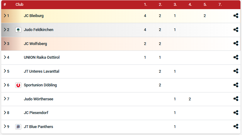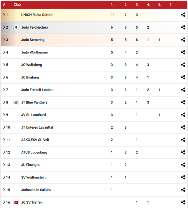 Platz 1 der Vereinswertung ging dieses Jahr an den Verein Judo Semering, gefolgt vom Judoclub Wolfsberg und dem Judoteam Blue Panthers.